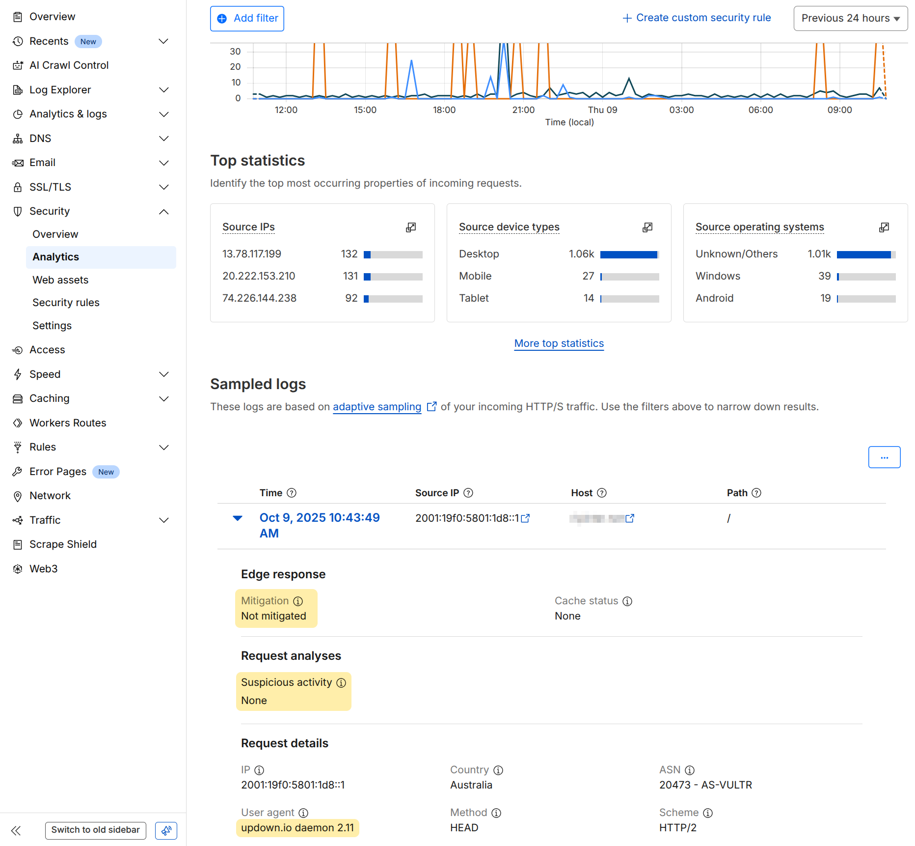 Here you can see requests allowed or blocked by Cloudflare and when they are blocked you can find the reason under Mitigation and/or Suspicious Activity.