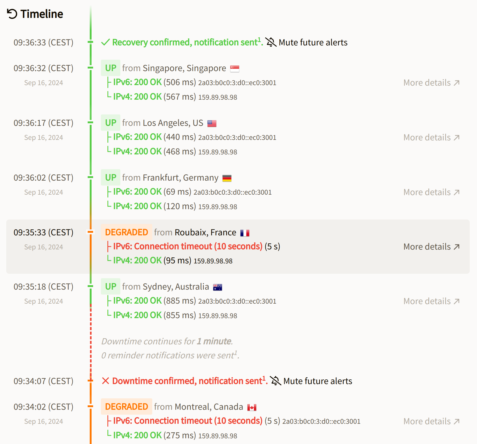 This is a really helpful feature for reporting back to stake-holders. I tested the API, and although you get time and duration of a failed check, I would also like to see (both on the web page and the API) from which location/locations the check failed. That is a nice way to identify if there is a routing problem causing a false positive, or if it is a wide-spread outage.